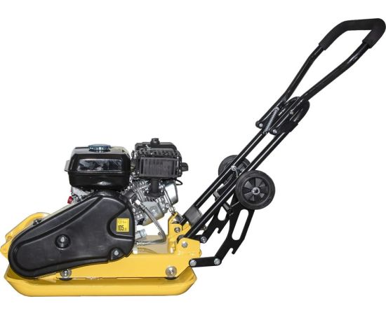 Двигатель виброплиты в сборе с основанием, рукоятка управления, подкатные колеса, крепежный комплект, паспорт изделия.