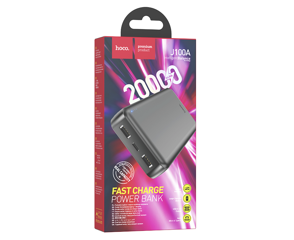 Универсальный внешний аккумулятор дает возможность многократно заряжать телефон и другие гаджеты без доступа к розетке и электрической сети. Ёмкость аккумулятора составляет 20000 mAh. Изготовлен из качественных и прочных материалов: пластика и поликарбоната, устойчивого к воздействию высоких температур. Оснащен двумя USB портами, что дает возможность заряжать два устройства одновременно. Напряжение на входе 5V. Сила тока на выходе 2.1 А. Корпус выполнен из высококачественного огнеупорного пластика. Hoco J100A имеет достаточно компактные размеры, поэтому устройство будет удобно брать с собой куда угодно. Выполнен в двух цветах.