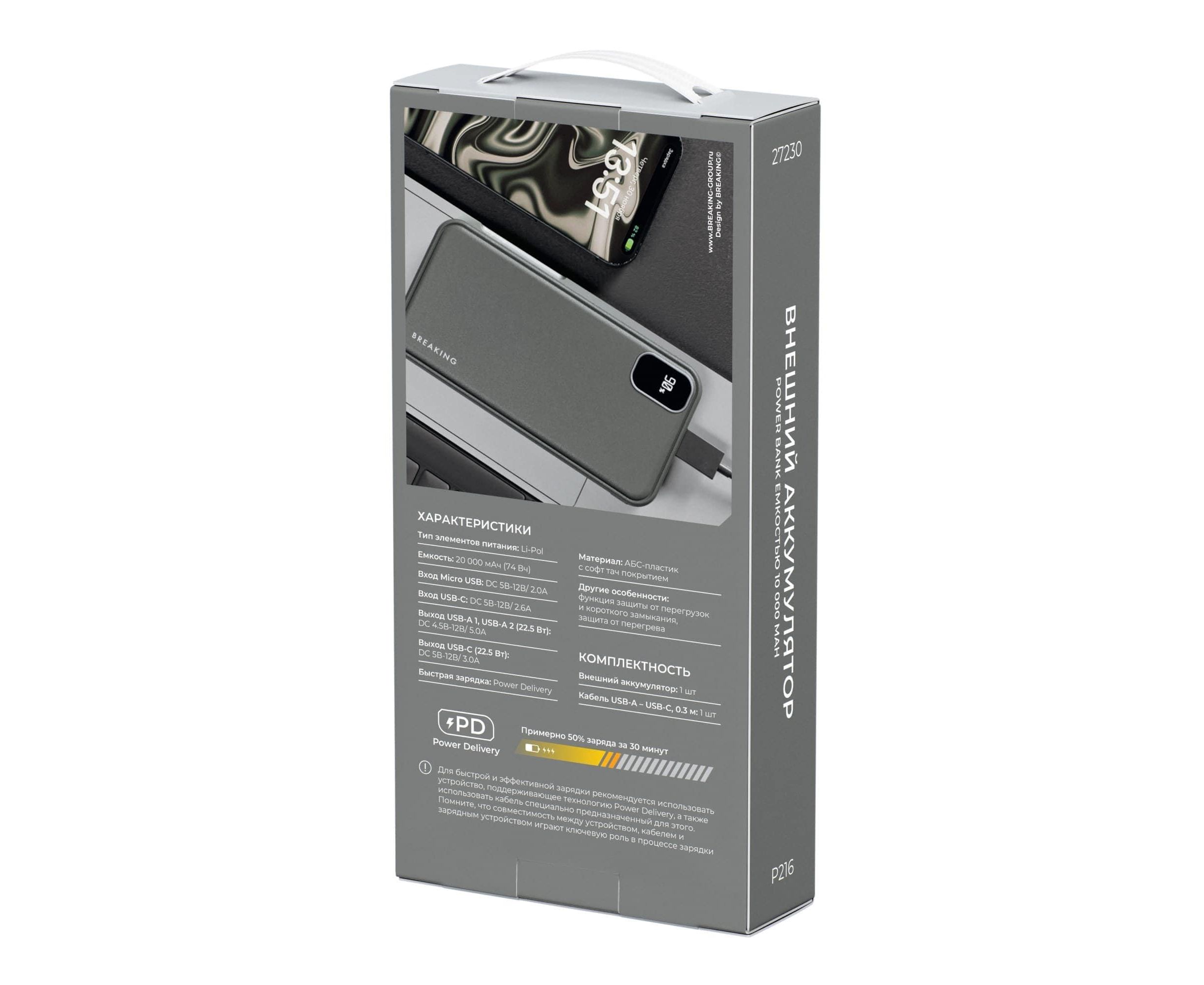 Внешний аккумулятор BREAKING P217 выполнен из прочного ABS-пластика. Емкость аккумулятора 20 000 mah. Модель рассчитана на входной ток Micro USB DC 5V-12V/ 2.0A, USB-C DC 5V-12V/ 2.0A и обеспечивает выходной ток USB-A DC 4,5V-12V/ 2,6A , выход USB-C DC 5V-12V/3.0A до 22.5W. Два разъема USB-A и один разъем USB-C позволяют заряжать одновременно три устройства. Модель поддерживает стандарт быстрой зарядки Power Delivery, технологию защиты от перегрузок и короткого замыкания. LED-дисплей отображает уровень заряда и разряда внешнего аккумулятора.