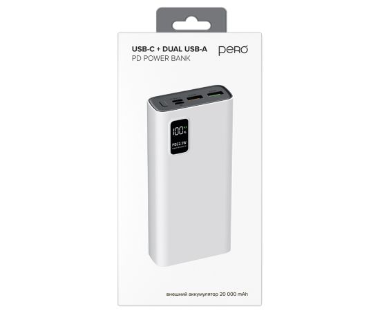 Внешний аккумулятор PERO PB06 20000 mAh, Li-Pol, output USB-C + 2 USB-A, белый