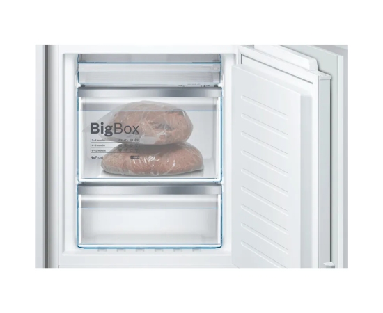Встраиваемый холодильник Bosch KIN86AF3M8 с нижней морозильной камерой и общим полезным объемом 255 л. Полки комбинированного холодильника-морозильника выполнены с «металлической» аппликацией. Установить и регулировать рабочие температуры в камерах можно на панели с LCD дисплеем. Удобно хранить крупногабаритные замороженные продукты в контейнере BigBox. В двухкамерном KIN86AF3M8 фиксированный фронт.
