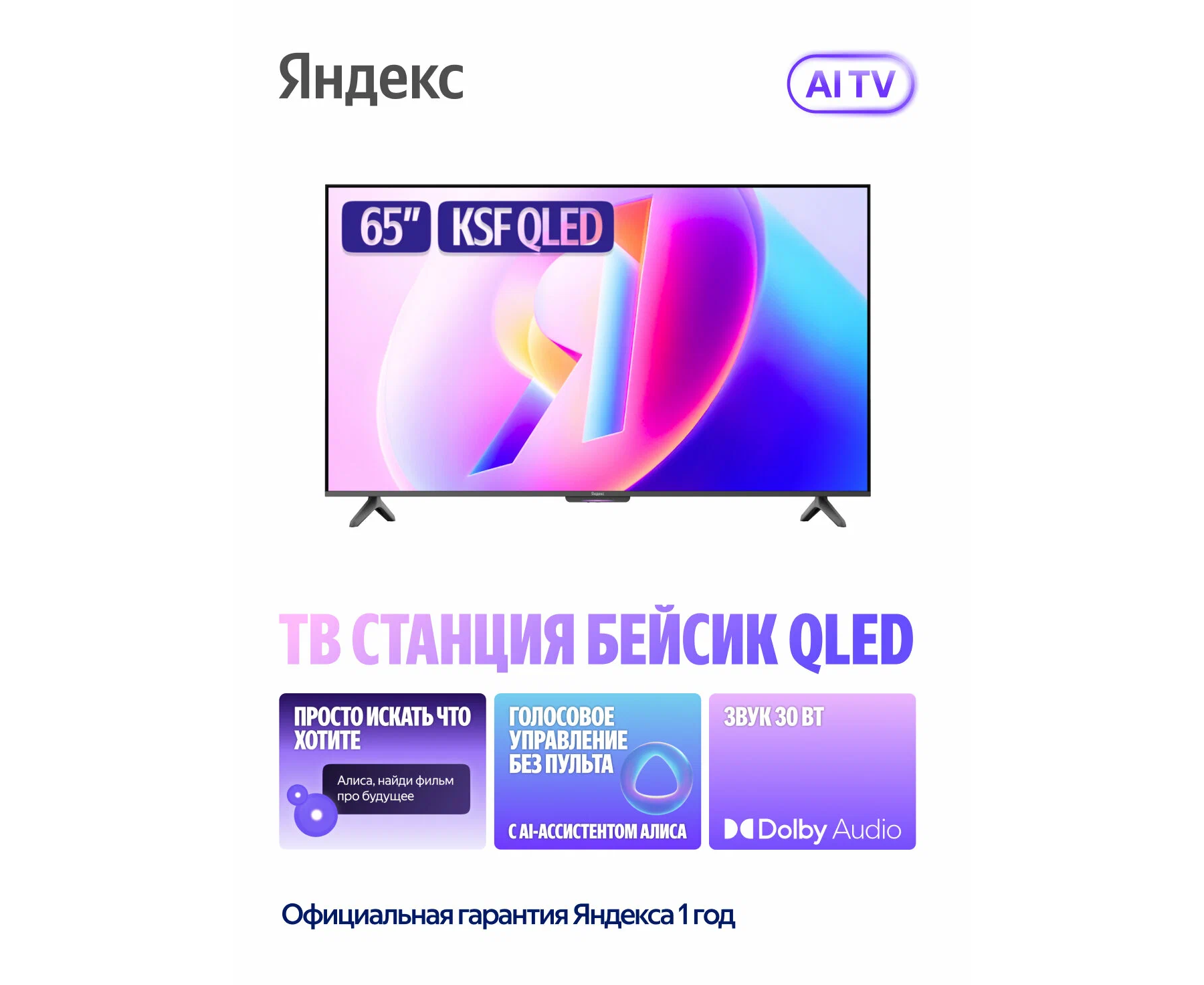 65" Телевизор YANDEX YNDX-00081 черный QLED 3840x2160, 4K Ultra HD, 60 Гц, WIFI, SMART TV, Яндекс ТВ Станция Про