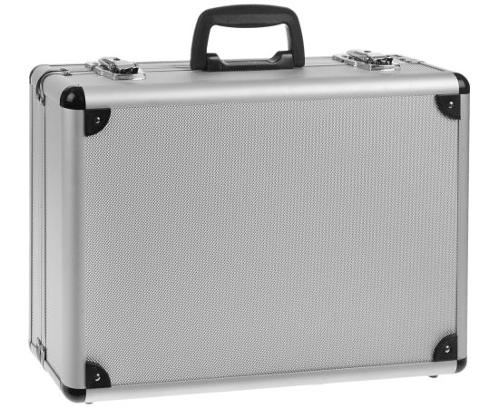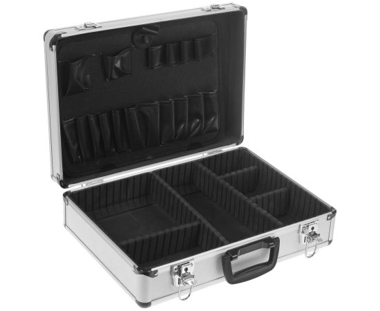 Ящик-чемодан предназначен для хранения и удобной транспортировки инструментов. Изготовлен из алюминия, а внутренняя отделка выполнена из мягкого пористого материала, что обеспечивает более бережное хранение инструмента. Переставные перегородки позволяют максимально эффективно использовать внутреннее пространство. Чемодан надежно закрывается с помощью металлических защелок. Удобная рукоятка обеспечивает комфортную переноску. Инструментальный ящик применяется как в профессиональной сфере, так и в быту: он очень вместительный, помогает упорядочить нужные в работе предметы и всегда держать их под рукой.