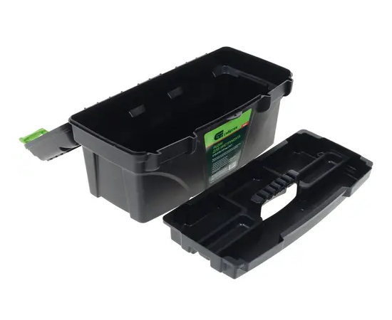 Кейс для инструмента, материалом для изготовления которого послужил прочный черный пластик, рассчитан на хранение и перевозку нескольких единиц ручного инструмента и рабочих принадлежностей для него.