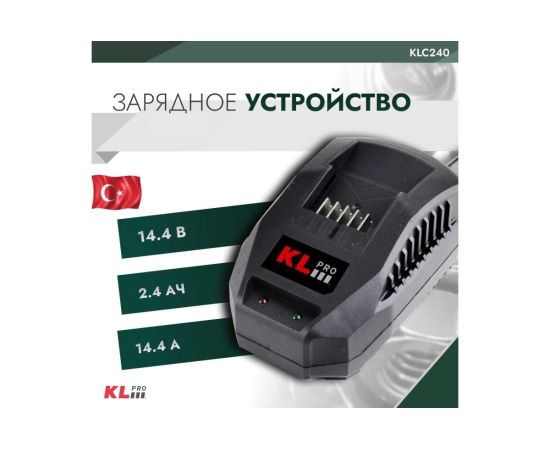 Зарядное устройство KLPRO KLC240 с максимальной потребляемой мощностью 14.4 А. Подходит для аккумуляторов, емкостью 2.4 Ач и напряжением 14.4 В. Работает от сети.