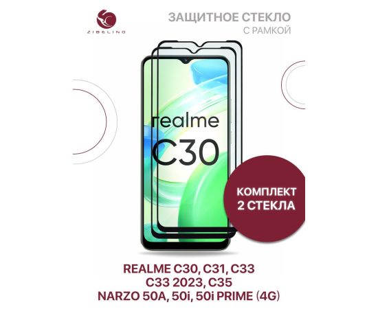 Защитное стекло (Комплект 2 шт) для Realme C30, C30s, C31, C33, C33 2023, C35 Realme Narzo 50A, 50i, 50i Prime с рамкой, Реалми С30 С31 С33 2023 С35 Нарзо 50А 50i 50i Прайм