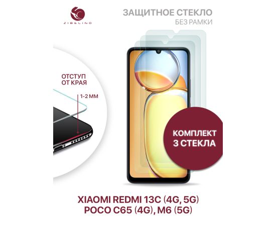 Защитное стекло (Комплект 3шт ) для Xiaomi Redmi 13C (4G, 5G), Poco C65 (4G), Poco M6 (5G) без рамки, с отступом от краев (Ксиоми Редми 13С (4G, 5G), Поко С 65 (4G), Поко М6 5G)