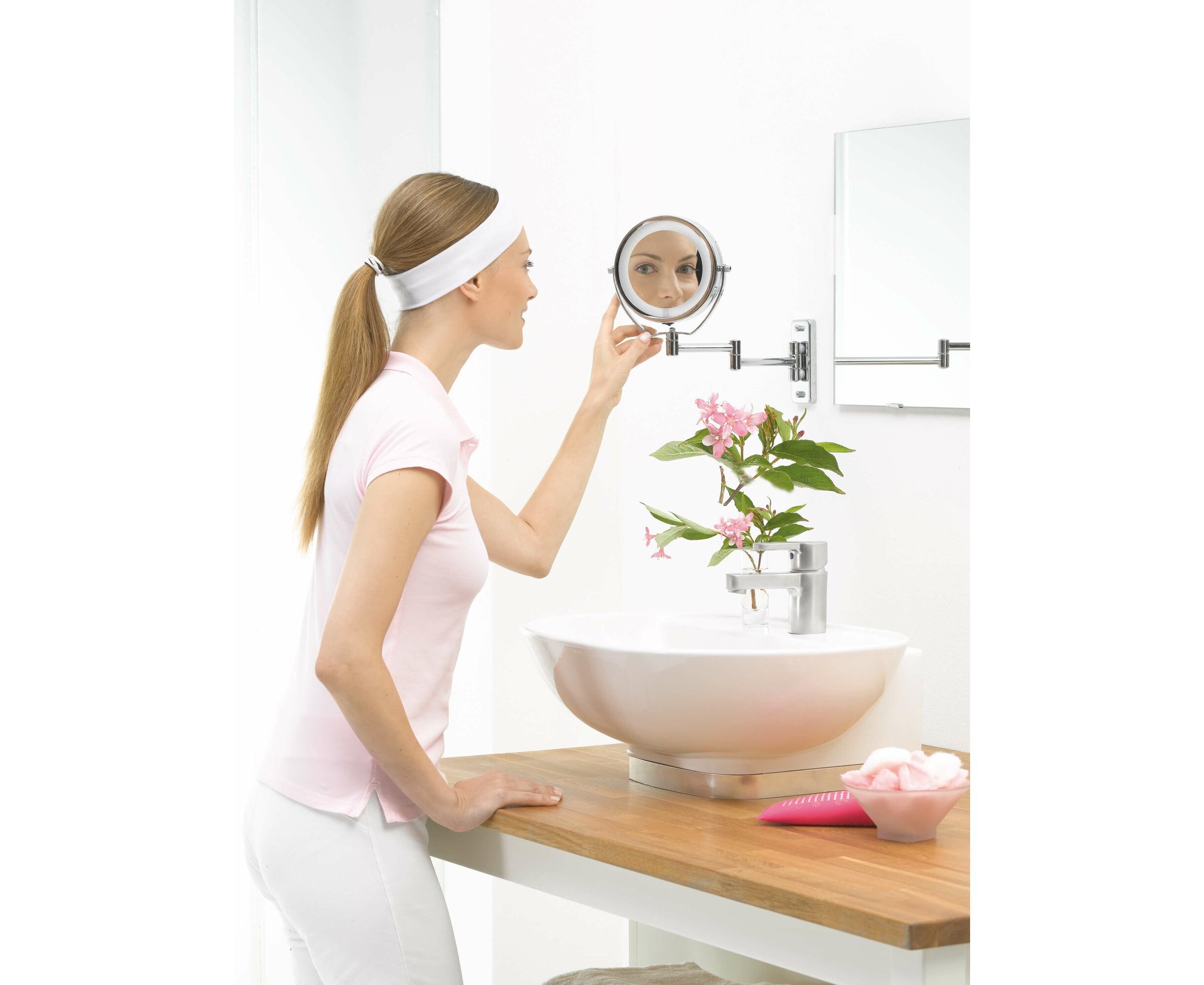 Настенное и настольное косметическое зеркало прекрасно подойдет для небольших ванных комнат. Его легко можно снять со стены и перенести в другую комнату или взять с собой в дорогу.