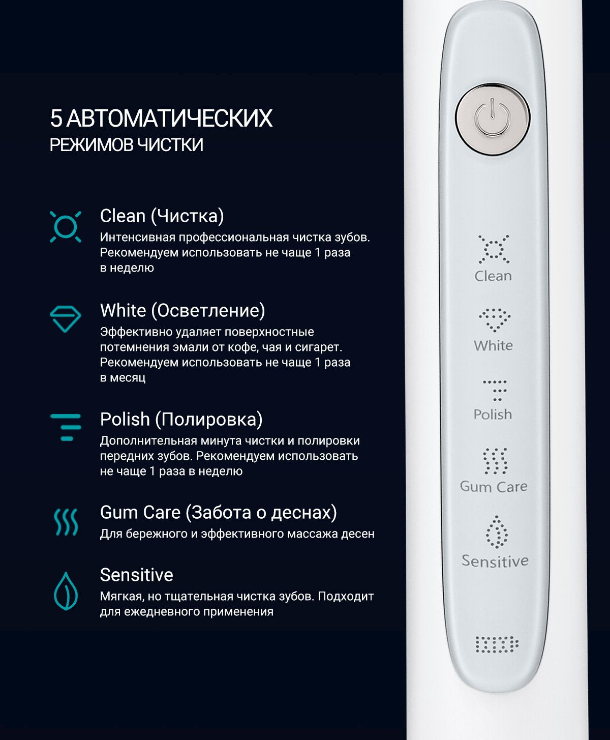 Особенности: 5 Режимов работы: Sensitive/Clean/White/Polish/Gum Care: режим Clean: 41000 пульсаций/мин, режим White: 48000 пульсаций/мин, режим Polish: 45000 пульсаций/мин, режим Gum care: 35000 пульсаций/мин, режим Sensitive: 31000 пульсаций/мин.